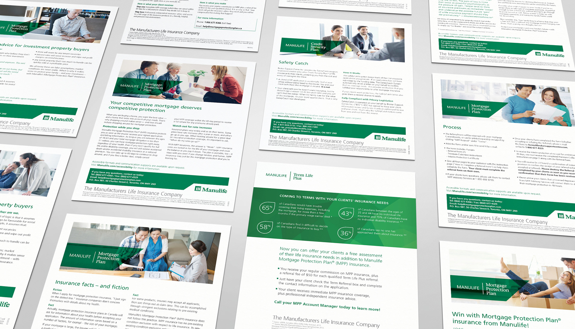 When Manulife purchased Benesure in 2014, I worked to bring three new products within the Mortgage Protection Plan (MPP) package under the Manulife brand umbrella. I created the new wordmarks to compliment the company logo and various branded elements, including the jewel pattern and icons. I designed the trade show banners that introduced the products at a national conventions and digital ads that featured on broker websites. In addition to ads and collateral, all existing forms and documents had to be recreated with new branded look in two languages.
